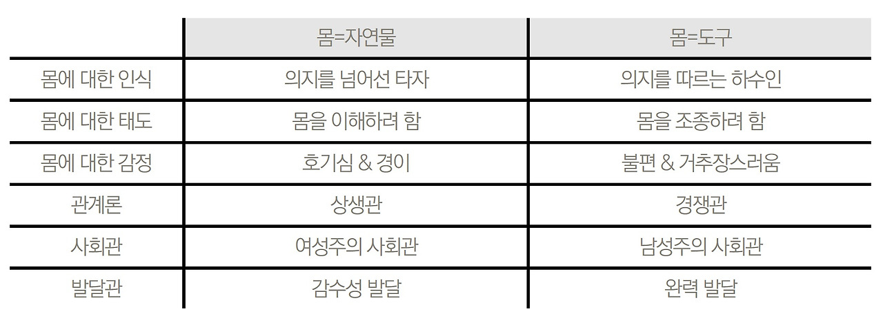 그에 반해 ‘몸=자연물’이라는 것은 ‘몸은 나와는 별개의 타자다’라는 생각을 기반으로 하고 있다. 여기선 ‘몸과 어떻게 조화를 이루어 살아갈 것인가?’라는 생각이 주를 이룬다. 그러려면 당연히 몸을 이해하는 게 먼저이며 몸의 상태를 받아들여 상생하려 한다. 무도의 기본이 바로 여기에서 나왔다. 이를 단순 대조하기 위해 아래와 같은 표를 만들면 이해하기가 훨씬 쉽다.