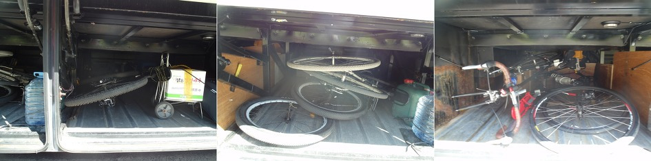 버스엔 총 네 칸의 짐칸이 있다. 그 중 한 칸은 버스를 청소하기 위한 도구들이 있기 때문에, 세 칸에만 짐을 실을 수 있다. 다행히 이 날엔 버스에 사람이 별로 타지 않았고 당연히 짐들도 많지 않았다. 우린 자전거를 싣기 위해 앞바퀴를 빼어 부피를 최소한으로 줄인 후에 한 대씩 싣기 시작했다. 민석이와 준영이는 능수능란하게 앞바퀴를 분리했지만 재익이와 현세는 해본 적이 없는지 쭈뼛쭈뼛 서 있더라. 그래서 나와 준영이가 도와주어 바로 분리할 수 있었다. 한 칸 당 앞바퀴만 뺀 자전거의 경우 2대를 실을 수 있고, 페달까지 뺄 경우 3대까지 실을 수 있다. 우리는 세 칸을 쓸 수 있었기에 넉넉하게 자전거를 실을 수 있었다. 네 대의 자전거를 실었는데 시간은 벌써 9시가 넘어가고 있었다. 우리 때문에 출발시간이 지연되고 있었던 것이다. 그래서 마지막 자전거는 힘껏 밀어 넣고 잽싸게 버스에 올라탔다. 아무래도 처음으로 자전거를 싣는 것이라 요령이 없어서 힘으로 구겨 넣듯 실었다는 표현이 정확하다.