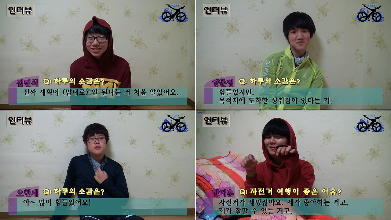민석이와 준영이, 재익이는 기초 체력이 되기 때문에 달리는 데에 문제없다. 하지만 현세는 체력이 좋지 않아 연습으로 달렸던 3번 내내 뒤처졌다. 근데 솔직히 체력이 안 좋다기보다 자전거 타는 것에 익숙하지 않기에 뒤처진다고 보아야 맞다. 왜냐 하면 작년 도보여행 때는 그 누구보다도 잘 걸었고, 한 번도 뒤처진 적은 없기 때문이다. 차라리 그 땐 재익이가 잘 걷지 못해 뒤졌고 짐을 나를 용도로 준비한 자전거를 다기도 했다.