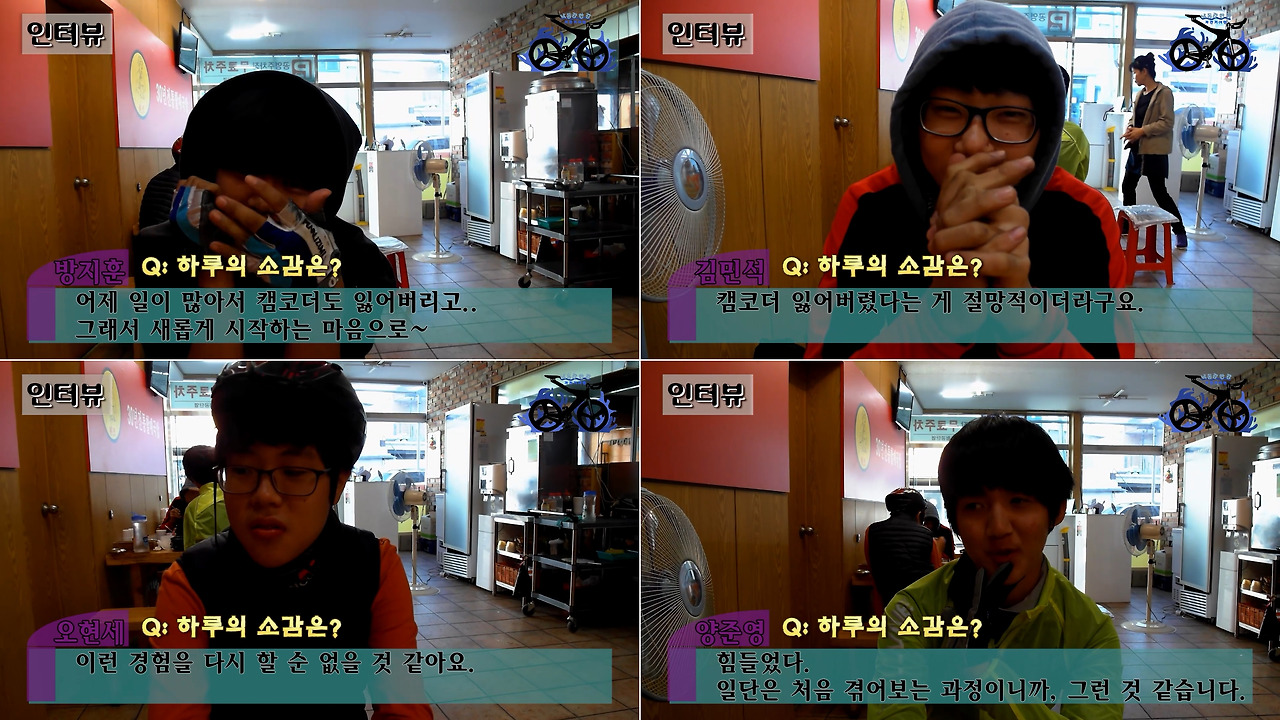 현세 자전거의 펑크로 시작된 예상치 못한 상황은, 어찌 보면 ‘다시는 경험하기 싫을 정도’로 힘든 순간이었다. 그렇게까지 일이 커질 줄 몰랐는데, 현세의 뒷바퀴 펑크를 시작으로 재익이 앞바퀴, 건빵 앞바퀴, 민석이 뒷바퀴, 현세 앞바퀴까지 소리 소문 없이 터지기 시작했다. 꼭 누군가 테스트를 하듯 그렇게 완벽하게 짜인 각본처럼 사태는 점점 커져 갔다. 거기에다가 이번 여행의 필수품인 캠코더까지 홀연히 사라졌으니, 어떤 순간이 이보다 더 비극적일 수 있을까?