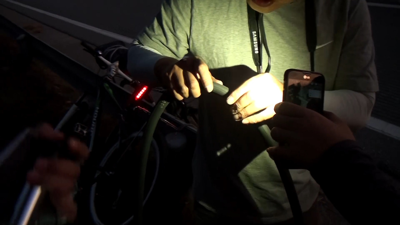 현세 앞바퀴의 펑크를 때우기 위해 이미 늦은 시간임에도 모두 멈춰야만 했다. 그쯤 되니 모두 넋이 나가기 일보 직전이었다. 핸드폰 플래시 불빛에 의존하여 어떻게든 때워보려 안간힘을 써보지만, 쉽지가 않았다. 그 때 진짜 문제가 뭔지를 알게 됐다. 바로 도로변에 있던 쓰레기를 밟고 달린 것이 문제라는 것을 말이다. 도로변엔 가시나무들이 있던 모양인데 우린 그 가시나무들을 밟고 달린 것이고 그러다 보니 모두 다 펑크가 난 것이다. 가시가 여러 군데 박혀 있어서 펑크패치로는 도무지 때울 수 없는 정도였다. 그래서 어쩔 수 없이 현세는 두 바퀴 모두 펑크 난 상태로 달려야 했다.