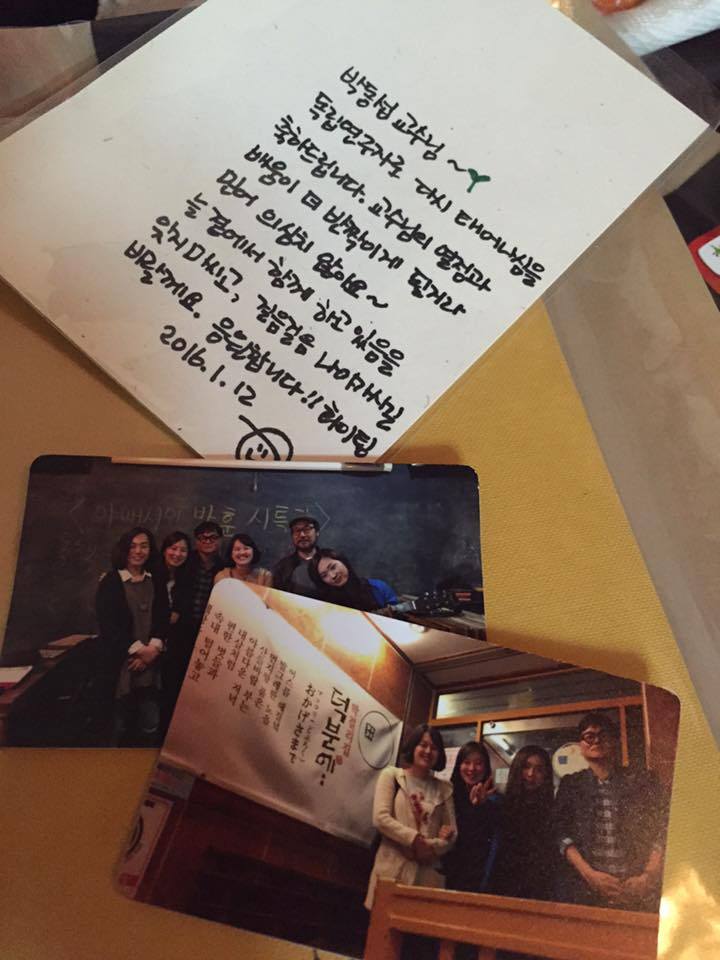 강의의 꽃은 뒷풀이(기승전‘뒷풀이’다)인데, 그 때 만난 에듀니티 김병주 대표도, 윤진쌤도 똑같은 말을 했다. 김병주 대표는 “오히려 잘 됐습니다!”라고 말문을 열며, “더 넓은 곳에서 더 자유롭게 연구활동과 강의를 하셔야죠”라고 덧붙였으며 윤진쌤은 준비한 선물에 “독립연구자로 다시 태어나심을 축하드립니다. 교수님의 열정과 배움이 더 반짝이게 될 거라 믿어 의심치 않아요~ 늘 곁에서 함께 하고 있음을 잊지 마시고, 걸음걸음 나아가시길 바랄께요. 응원합니다!! 파이팅”이라 썼다.