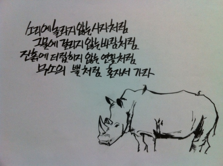 그런데 아주 파격적이며 충격적인 이야기를 서슴없이 한다. 지금 들어도 섬뜩하지만 ‘무쏘의 뿔처럼 홀로 갈’ 줄 아는 의연함이 보이는 문장이라 할 수 있다. 길에서 마주치는 온갖 영향력 있는 단어들, 영향력 있는 사람들, 영향력 있는 철학들을 모두 가차 없이 죽이라고 하니 말이다. 물론 여기서 죽인다는 표현은 실제로 칼부림을 하라는 표현은 아니고, 정신적으로 칼부림 이상의 죽일 정도의 결단력이 필요하다는 표현이다. 부처든, 조사든, 맑스든, 레비나스든 어떤 순간엔 나에게 절대적으로 필요한 자양분을 줘서 의식을 고양시킬 것이다. 하지만 그 순간에 머물러 그런 것들을 ‘하나의 완벽한 상像’으로 굳힐 경우, 그건 또 하나의 우상이 되어 다른 것들을 옥죄기 시작한다. 그러니 만나서 감화를 받았으면 거기에 머물려 하기보다 어느 순간엔 죽여야만 한다. 그래야만 비로소 외부의 사물에 구속받지 않고 자유자재로이 나갈 수 있다.