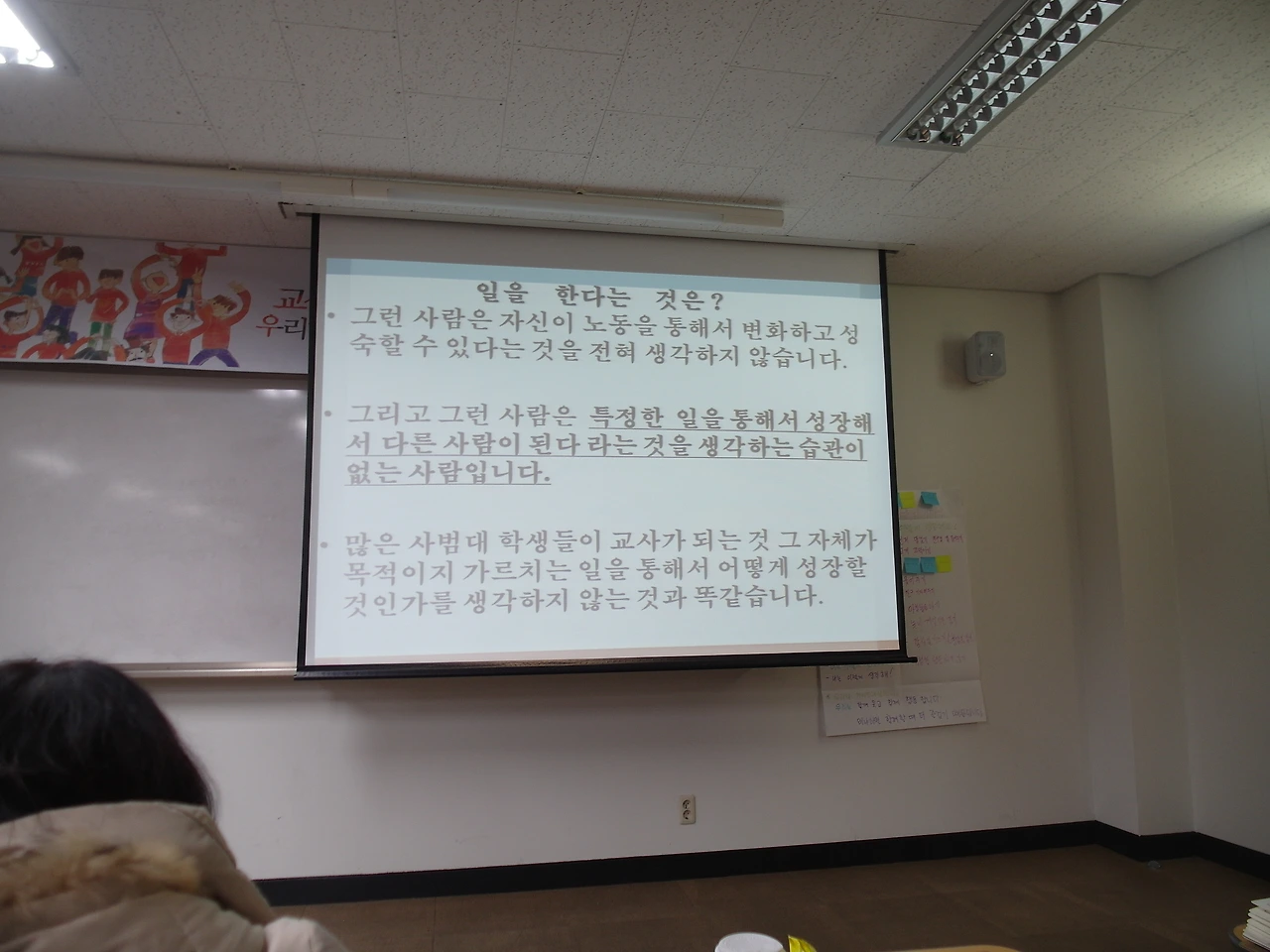 동섭쌤이 전주 신흥고(모교 이름을 여기서 듣게 되니 은근 반갑다)에서 특강을 하게 되었을 때, 담당자가 주제를 물어봤다고 한다. 그래서 그 때 발작적으로 제목이 떠올라 “지금 왜 칭송받지 못하는 교사들이 필요한가?”라고 또박또박 제목을 알려줬단다. 그리고 일주일이 흘러 다시 전화가 와서 강의 제목을 확인하는데, 그 때 깜짝 놀랐다는 것이다. 과연 어떤 대화가 오고 간 것일까? 담당자는 강의 제목을 “지금 왜 칭송받는 교사들이 필요한가?”라고 말했기 때문이다.