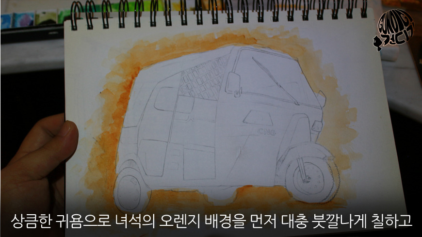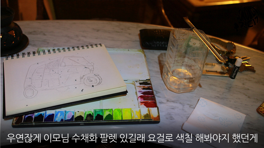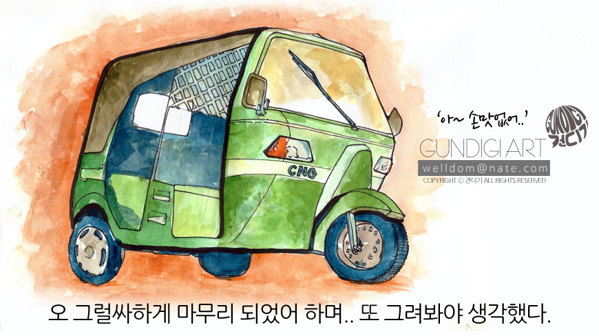 처음에는 이모부 퇴근하시고 홈바에 앉아 무언가 하고 있음 이모부랑 이야기도 할 수 있고 좋겠다 해서 그리기 시작했는데 수작업을 그린 그림들은 그 만큼의 값어치를 하겠지 생각하며 그림손 놀리면 뭐하겠나 그려본게 방글라데시 대표 교통수단 CNG 수채화물감은 고등학교때 이후로 한번도 손대본적 없는 영역인데 (입시미술 조소했뜸) 잼나네요. 하다보니 농도가 얼마나 중요한지 농도의 맛이 무엇인지는 아직 모르겠고 그냥 취미로 그리는 것이니 그냥 보이는 대로 보시기 바랍니다.