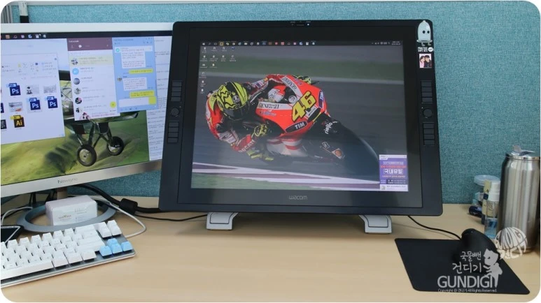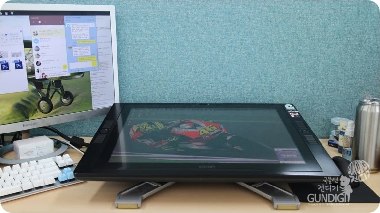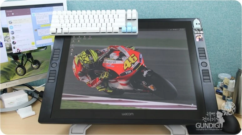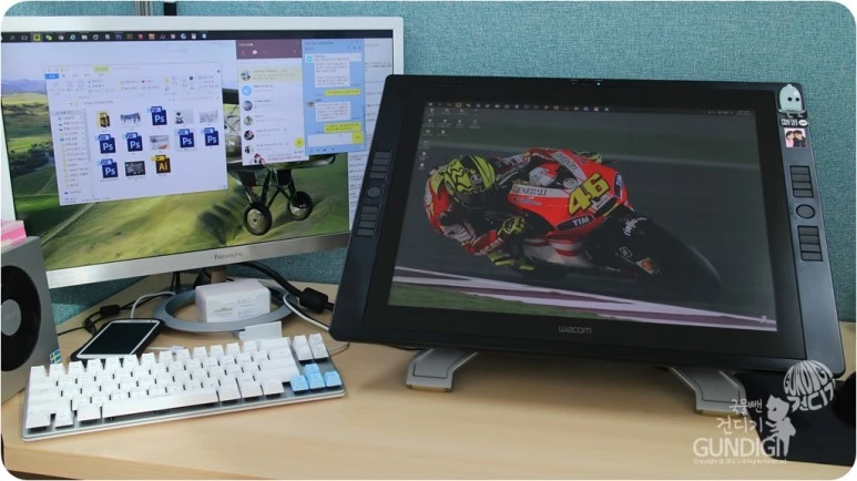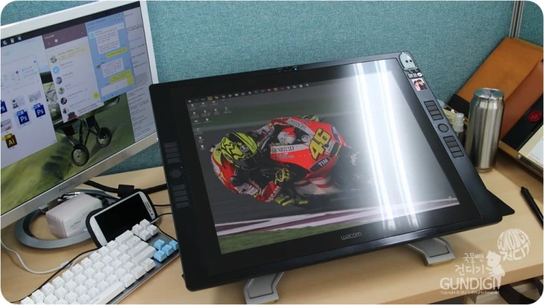하루의 시작을 모니터에 어제 묻혀놓은 유분을 닦아 내며 시작하는 기분은 모니터 타블렛만의 특징 중 하나이기도 하죠. 직장다니던 시절 월급을 모아 이 장비를 마련했을때를 생각하면 드라마에서 처럼 신티크를 부수고 비오는 옥상에 방치하는 모습을 보고 있자면 아마 저처럼 속이 타들어 갈겁니다.