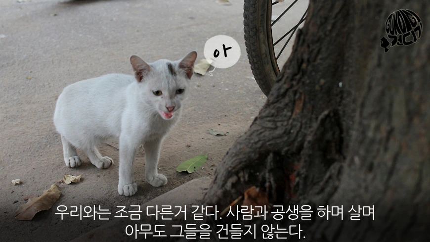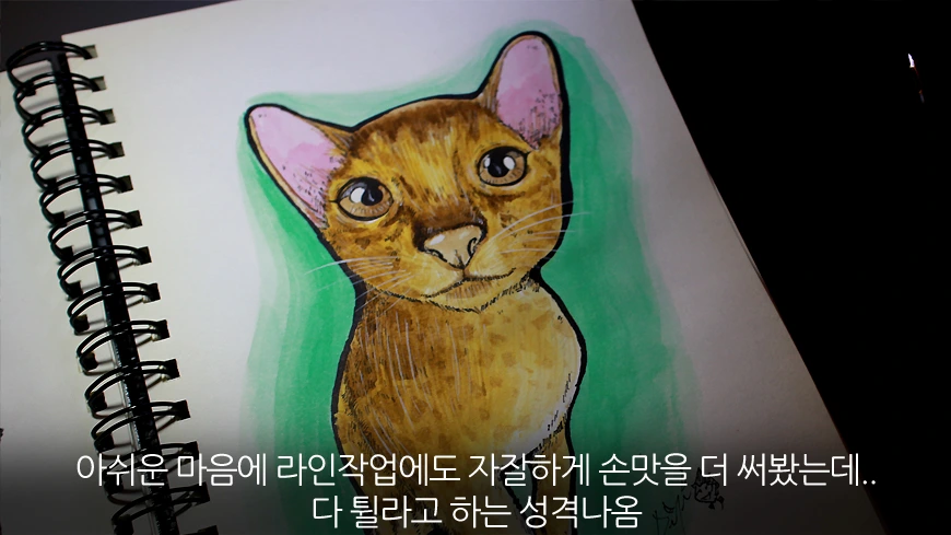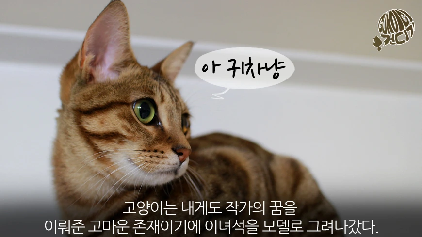 유유라는 고양이를 1년동안 길렀던 적이 있습니다. 물론 지금에 책을 내준것도 그 고양이와의 스토리며 고양이를 좋아하는 팬들이 저절로 제 그림을 좋아해주시기도 했죠. 손목에 고양이 발톱 상처가 자살 상저로 오인을 한적도 있고 스웨터나 털옷은 고양이 털때문에 입을 엄두도 나지 않습니다. 더욱이 강아지와는 넘사벽 변냄새는 원룸방을 테러블공간으로 만들기 충분했죠. 거기에 사막의 식물뭉치처럼 바람만 불면 고양이 털뭉치가 데굴데굴 구르고 여유롭게 강아지와 같은 산책은 엄두도 나지 않으며, 가슴팍에 울버린 자국을 남겨준 목욕시키기도 굉장히 어렵죠.