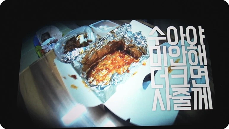 그래서 짐벌에 액션캠 끼워서 우는 수아와 치킨을 동시에 찍었습니다.