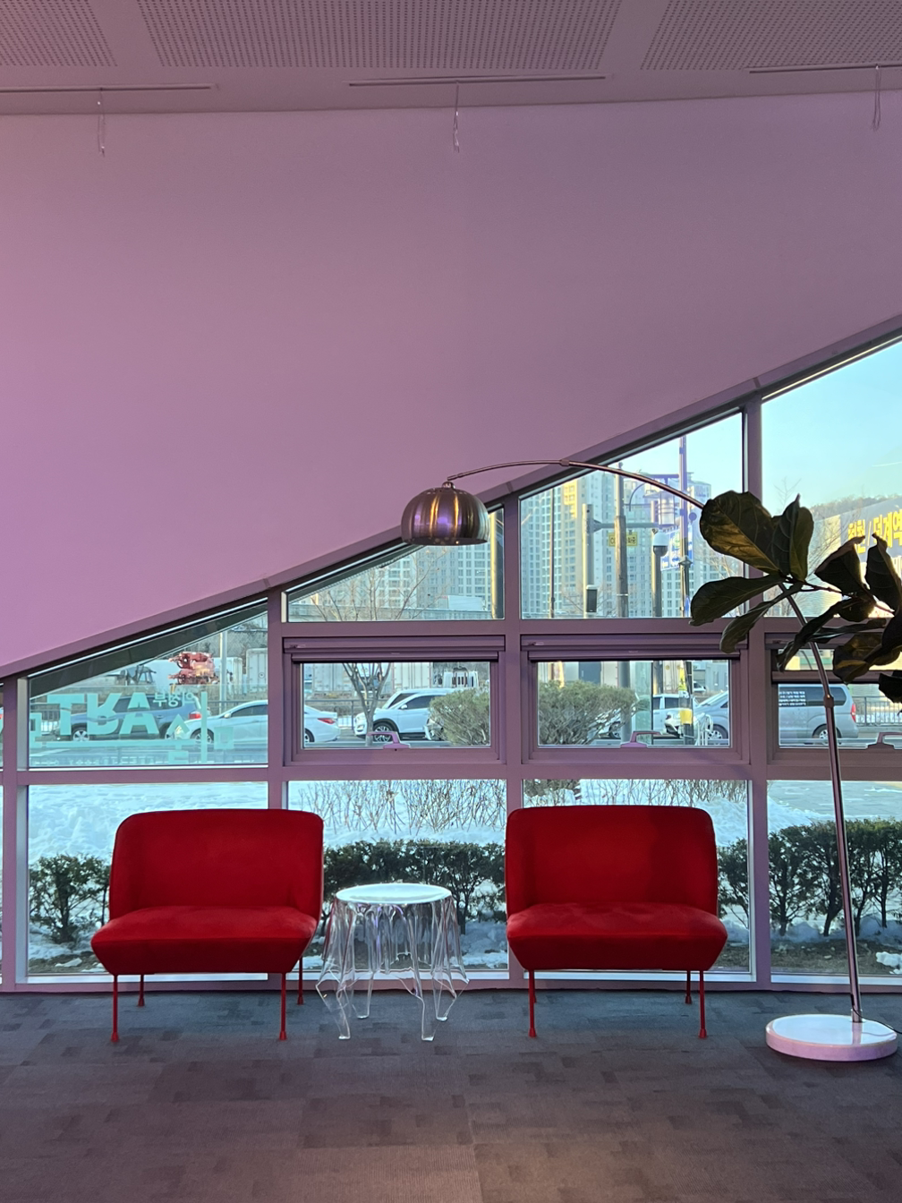 빨간 의자에 머리 위에서부터 내려오는 조명 밑에서 책이 얼마나 잘 읽힐까요~