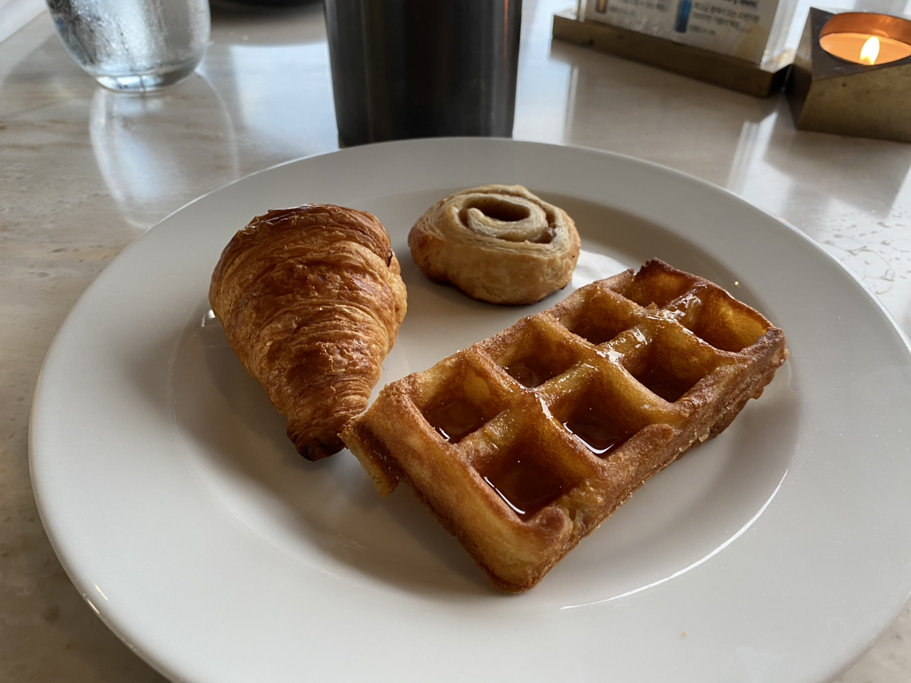 뷔페코스로서!! 저는 우선 달달한 크로아상과 와플 그리고 시나몬이 켵들어진 빵으로 시작했습니다.