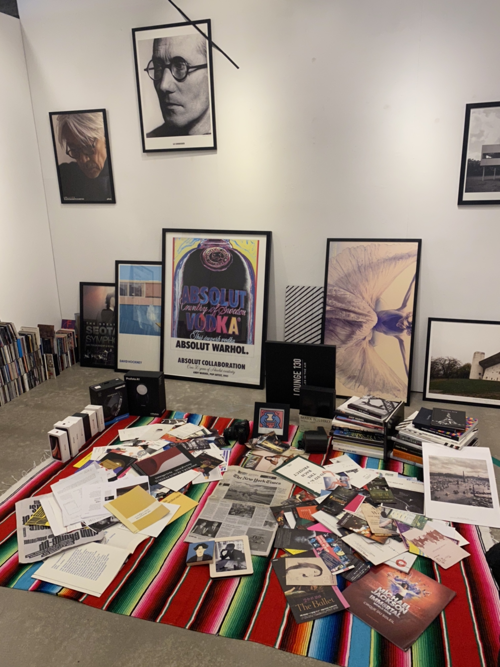 작가의 책, 음반, 포스터 등 그 동안 작가로서 인간 구제치로서 인생을 함께한 수많은 것들이 함께 모아져 있습니다.