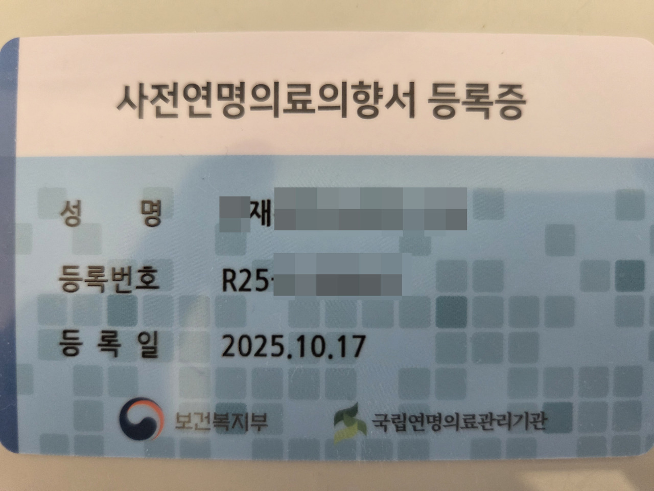 '연명 치료 거부' 카드가 언제 올지 몰랐기에 잊고 지내고 있었는데, 담당자분 설명과는 달리 생각보다 빨리 '연명 치료 거부'카드가 도착했습니다. 우편물 봉투를 열고 카드를 꺼내 보는 순간, 왠지 모르게 뿌듯했습니다. 마치 칭찬받은 아이처럼요. 다만 주민등록증이나 운전면허증 같은 기존 신분증에도 함께 표시되면 얼마나 편할까 하는 생각이 들었어요. 모바일 신분증에도 적용이 된다면 더 좋겠다는 생각도 잠시 했고요. 언젠가 되지 않을까 하는 기대를 해봅니다