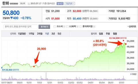 이를 반영하듯, 한화 주식또한 + 88.8%의 엄청난 상승률을 보임.