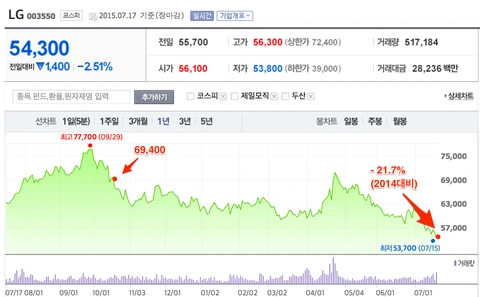 반면 LG 전자의 주식은 끝을 모르게 내려가고 있죠.
