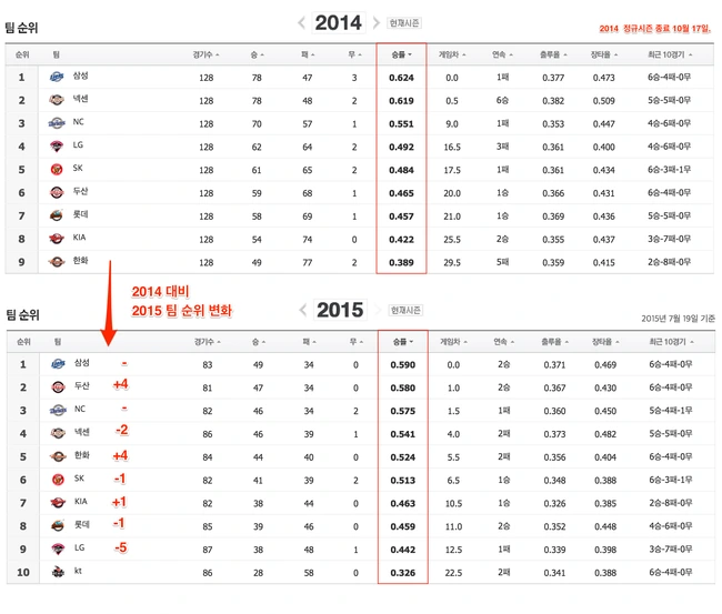 위 그림은 2014년 프로야구 정규시즌 종료 성적과 2015년 상반기 종료 성적을 보여줍니다.