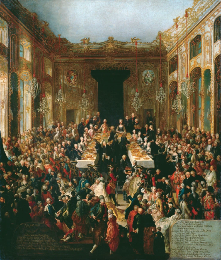 저는 처음 이 그림을 봤을 때 이들이 축하연에 초대된 손님들인 줄로만 알았습니다. 그런데 그게 아니더라고요. 합스부르크 왕가에는 공식 행사가 열리면 황실 가족들이 식사하는 장면을 공개하는 전통이 내려왔다고 합니다. 즉 이 많은 인파는 황실 사람들이 밥 먹는 모습을 구경하려 왔다는 거죠.