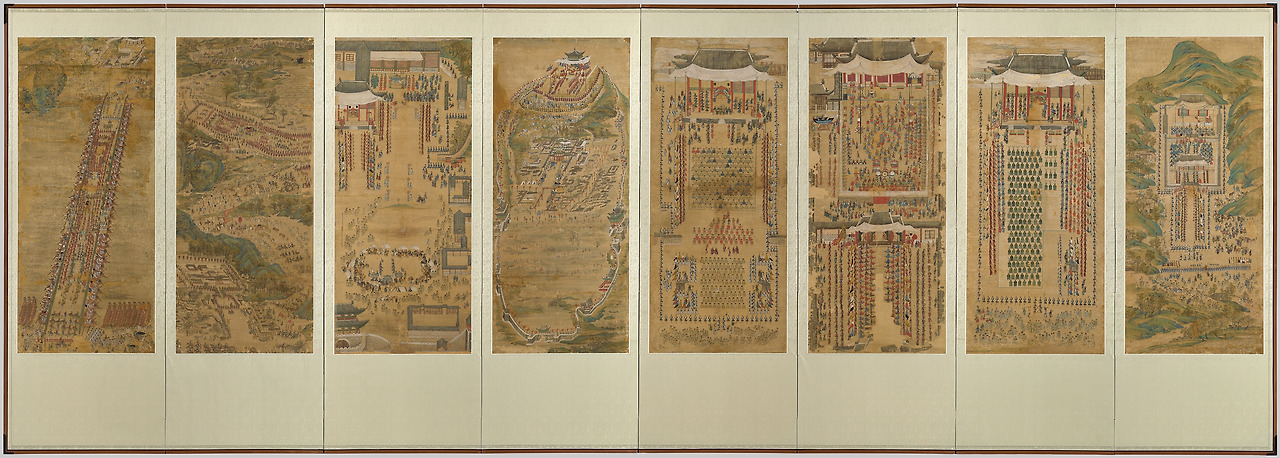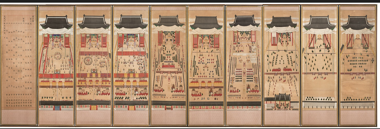조선시대에는 임금이 참여하는 큰 행사가 열리면 이 날을 매우 디테일하게 그림으로 기록해 남겼습니다. 이는 중요한 국가 기록물이자 예술적으로도 훌륭한 작품들이었어요. 디테일한 이 그림에는 당연히 참석자 모두를 그려넣었는데요. 보통 국왕은 그리지 않고 특정 물건을 그려서 위치만 표시했습니다. 그 물건이 바로 <일월오봉도>예요. 실제 사례를 보여드릴게요.