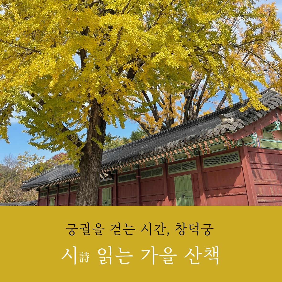 얼마 전 들었던 말입니다. 듣자마자 가을을 가장 정확하게 정의한 말이라 생각했어요. 그렇게 좋은 계절에 궁궐에서 만나 고운 시와 문장을 읽으려고요. 함께 산책하는 분들에게 여러분이 좋아하는 시를 들려주셔도 좋아요. 지금 읽고 있는 책 몇 문장 소개해주셔도 환영하고요. 당연히 그냥 오셔도 괜찮답니다. 창덕궁의 가을을 느낄 수 있는 장소로 안내하겠습니다. 천천히 걷다 우리의 마음 붙잡는 곳 있다면 어디든 오래 머물다 오려고요. 함께 걸어요.