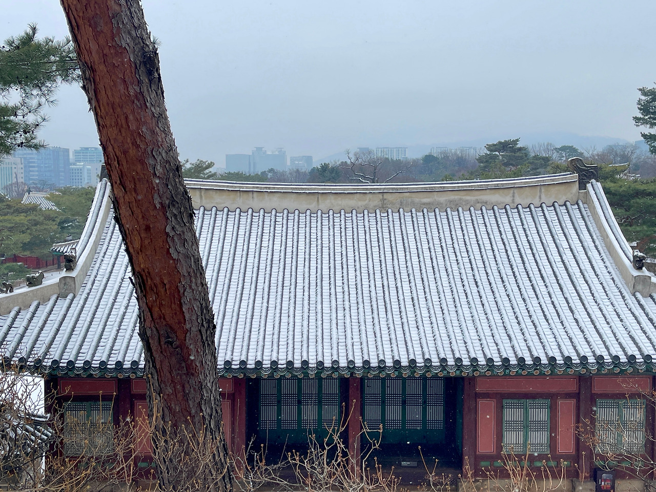 창경궁에는 안쪽에 언덕이 있어 주변에 있는 지붕을 위에서 내려다보듯 감상할 수가 있습니다. 요즘 같은 겨울에 눈이 오면 어두운 색 지붕 기와가 새하얗게 변한 모습을 볼 기회도 있고 말이죠. 얼마전 예쁘게 눈이 내린 날 창경궁에 가서 찍은 사진입니다. 차가워진 손 ‘호~호~’ 입김으로 데우면서, 흰눈이 쌓인 양화당과 통명전 지붕 뒷모습을 한참 보다 돌아왔지요.^^