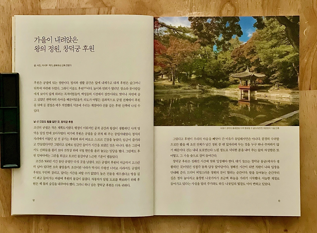 iM뱅크(구 대구은행)에서 발행하는 사외보 ⟪향토와 문화⟫에 ‘창덕궁 후원’을 주제로 글을 썼습니다. 후원은 갈 때마다 새로운 모습을 보여주는 곳입니다. 그래서 늘 설레는 장소죠. 부용지와 애련지, 관람지, 연경당 주변을 소개했습니다.