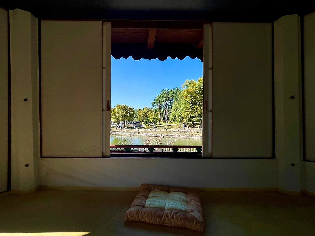 경복궁 향원정 1층 실내입니다. 건청궁에서 생활하던 고종과 명성황후는 취향교를 건너 향원정에 들어가 여유로운 시간을 자주 즐겼습니다. 1층 바닥은 온돌이 깔려 있어 한겨울에도 방에 앉아 풍경 감상을 했다고 전하는데요. 아마도 방바닥에 놓인 방석에 앉아 창을 열고 멀리 펼쳐지는 경복궁 주변을 봤겠죠.