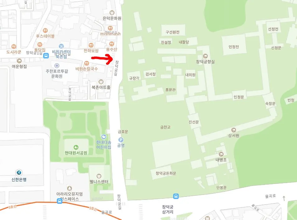창덕궁 돈화문 왼쪽 ‘창덕궁길’로 약 200m 들어가다 보면 ‘용수산’이라는 한정식 집이 있는 삼거리가 나옵니다. 여기서 좌회전해서 20~30m 걸어 올라가다(약간 경사진 길입니다.) 뒤로 ‘휙!’ 돌면 사진에서 보이는 풍경이 눈앞에 펼쳐집니다.