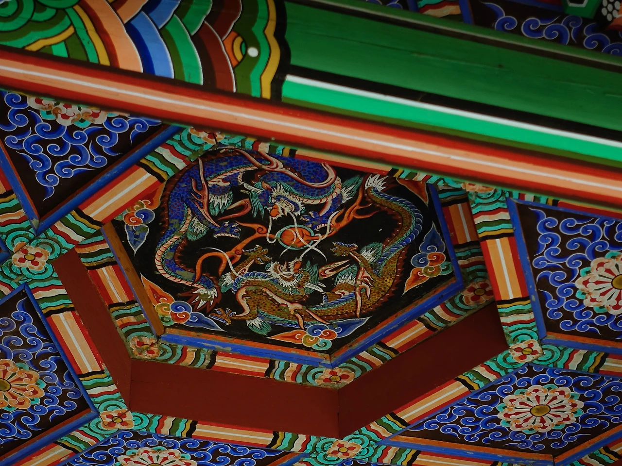 천장 중앙에 걸린 용 두 마리 장식도 빼놓지 않고 봐주세요. 부리부리한 눈으로 서로를 노려보고 있는 두 마리 용이 천장에 달려 있습니다.