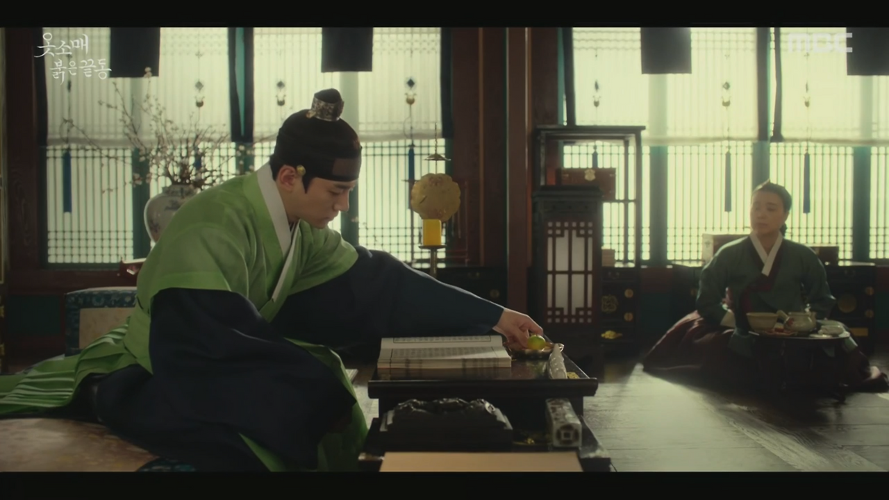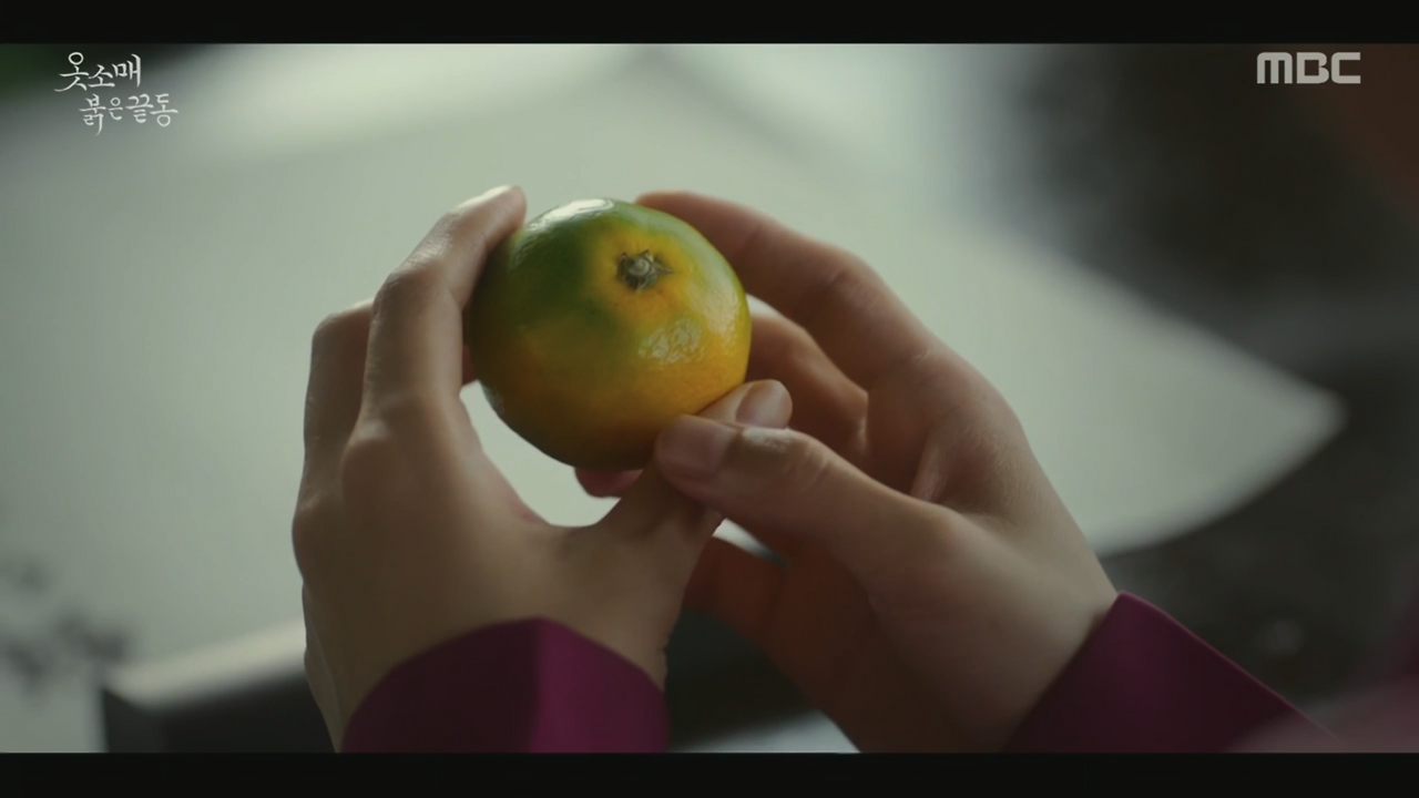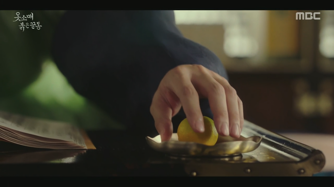감귤 하나를 두고 옥신각신하는 것처럼 보이지만, 사실 감귤은 곧 상대를 향한 마음이 아니었을까 싶어요. 산은 감귤 하나를 건네며, 딱 이만큼 덕임에게 다가가고 싶었을 거예요. 덕임 역시 감귤을 받는다는 건 산의 마음을 그만큼 허락해야 한다고 생각했을 테고요.