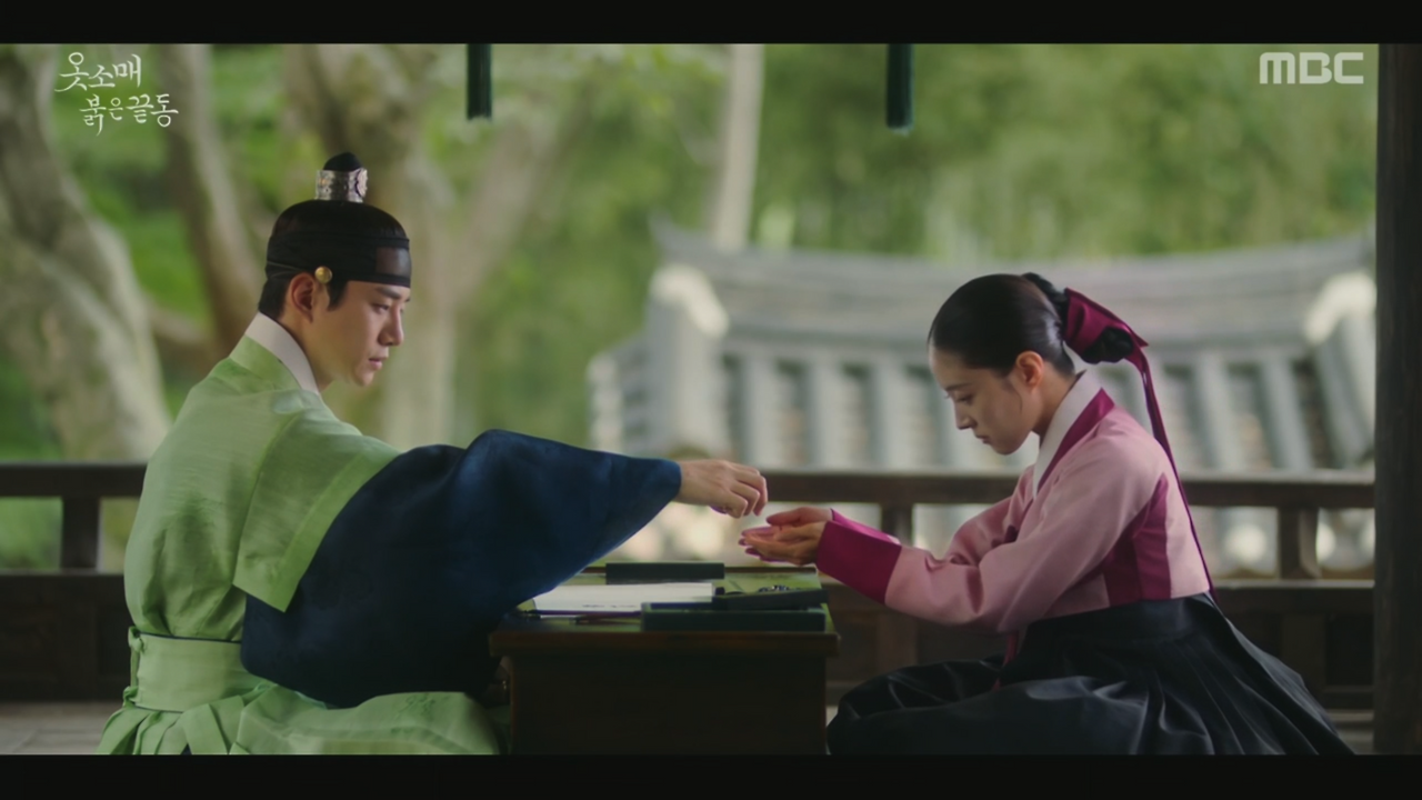 04회에서 산은 ‘세심함’이라는 단어로 덕임의 마음을 살짝 흔들어 놓았습니다. 둘이 서 있던 바로 옆 애련지 연못 수면에 잔물결을 일으키듯 말이죠. 07회에서 산은 좀 더 적극적인 방법으로 덕임을 향한 마음을 드러내는데요.