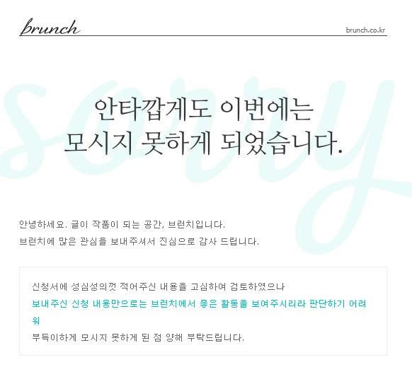 횟수가 거듭될수록 나에게 이 멘트의 무게감은 서서히 줄어들었다. 마치 다음에도 떨어질거라는 무의식중의 확신이 있었던 것 같다. 계속해서 시도는 하면서도 브런치 작가의 벽이 너무 높게만 느껴졌던 것 같다.