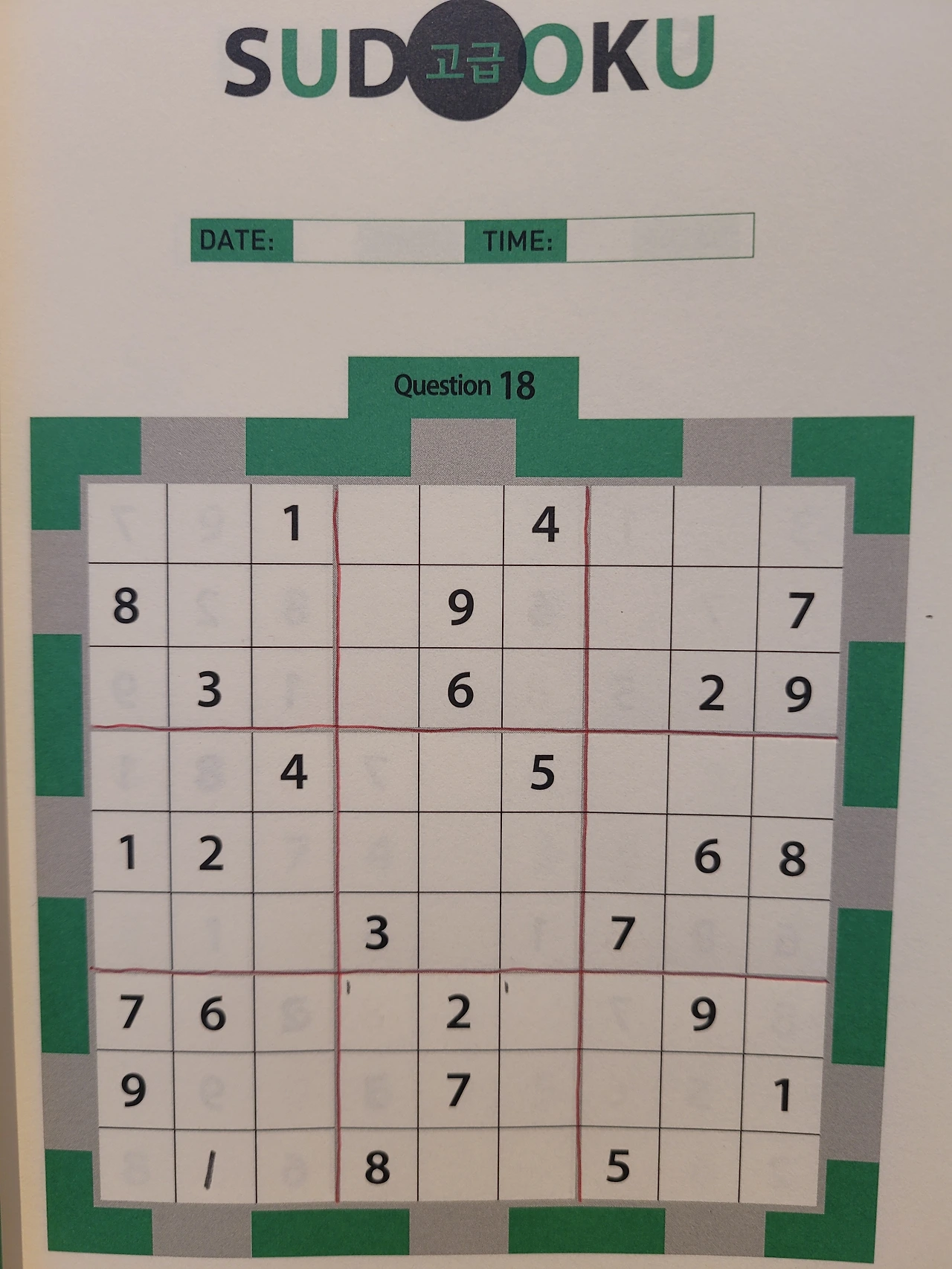 전에 하도 많이 해서 중급 정도는 할 수 있기에 실력도 키울 겸 고급책을 들었다. 집에 와서 연필과 지우개를 들고 한 문제에 도전했다. 역시 고급이라 그런지 생각보다 쉽지 않았다. 연필로 숫자를 썼다 지웠다를 반복했다. 그러다 한 문제를 완성했다. 어렵게 해결해서 그런지 성취감이 꽤 컸다.