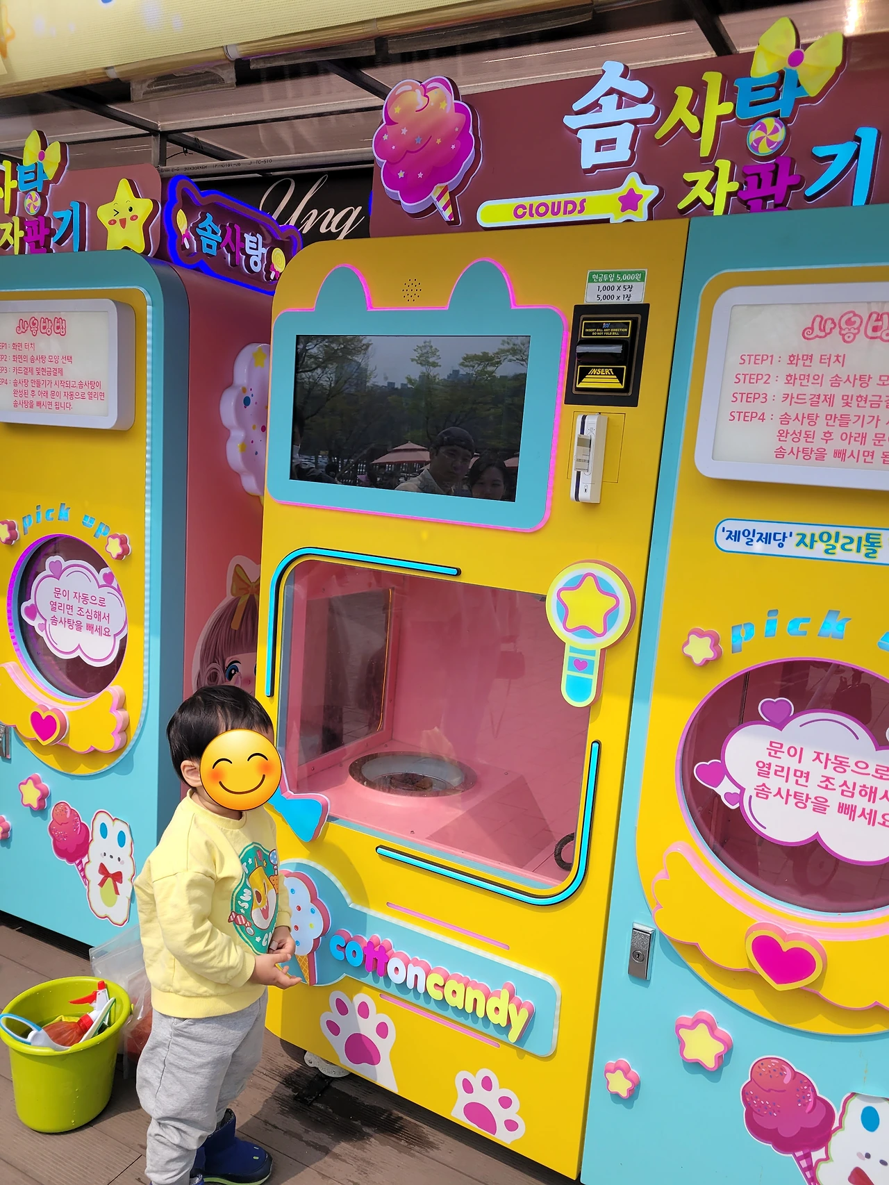 이전에 여러 번 놀러 가면 솜사탕을 사주기로 약속한 터라 사주기로 했다. 솜사탕 기계는 원하는 모양을 선택하면 그 모양대로 솜사탕이 만들어지는데 그 모습을 통유리로 볼 수 있다. 아이에게 모양을 선택하게 한 후 기다리니 솜사탕이 만들어지기 시작했다. 한참을 기계가 움직이더니 아이가 고른 꽃모양 솜사탕이 완성됐다. 아이는 솜사탕을 받아 들고 좋아했다. 아이에게 달라고 조르며 남편과 셋이 솜사탕을 먹으며 가는데 불에 구워주는 가래떡이 눈에 들어왔다. 가격을 보니 2개에 천 원, 5개에 2천 원이었다.