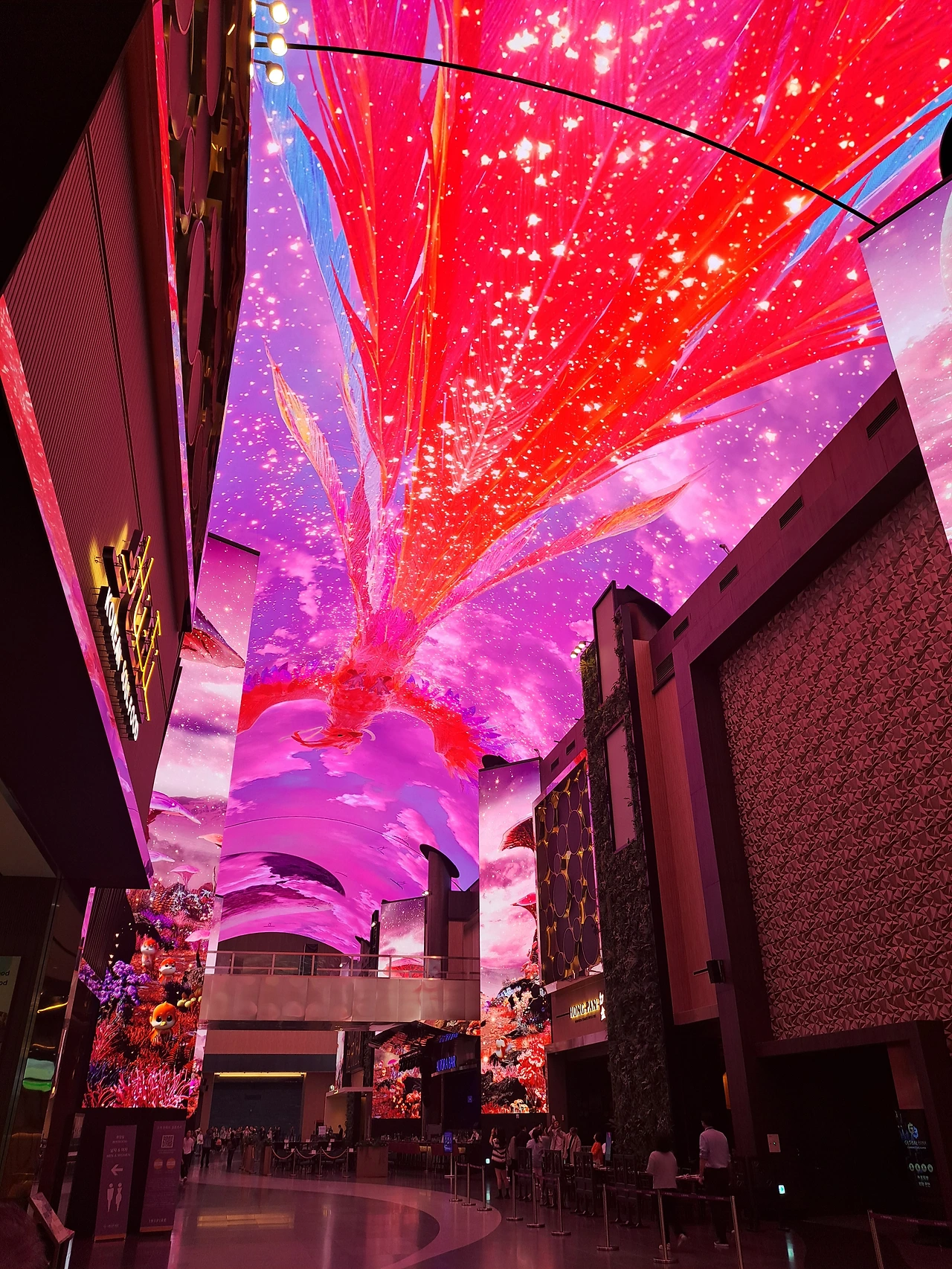 차로 1시간 정도 걸려 그동안 가고 싶었던 인스파이어 엔터테인먼트 리조트에 도착했다. 유명한 대형 스크린 화면을 보려면 E주차구역으로 가야 한다는 글을 접하고 그곳으로 향했다. 역시나 주차장에 도착해 건물 안으로 들어가니 벽면과 천장을 꽉 채운 영상이 우리를 맞이했다.