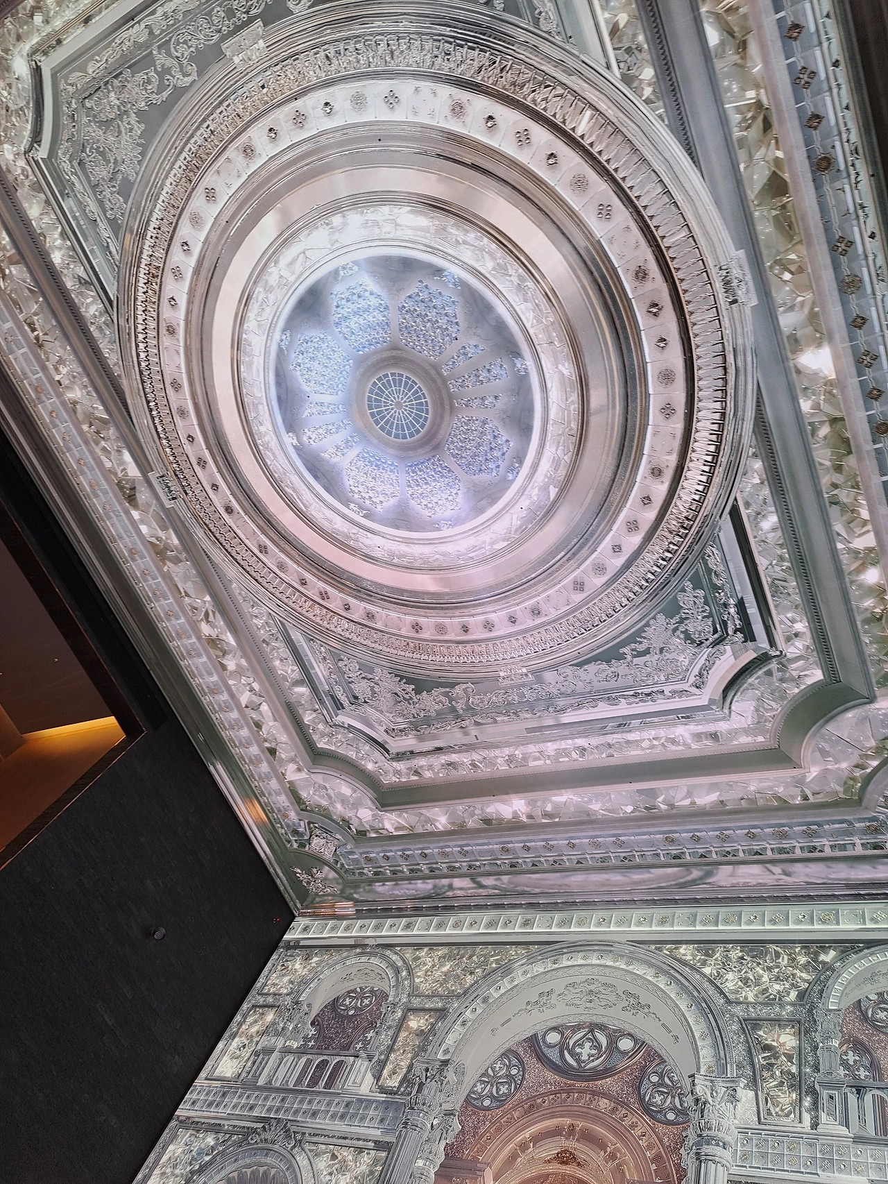 정시가 되니 영상이 바뀌면서 오로라쇼가 시작됐다. 로켓을 타고 우주를 지나 또 다른 행성에 가는 내용인 것 같았다. 중간중간 행성도 나오고 토성 고리도 나오고 불새도 나왔다. 넓은 천장 화면에 커다란 불새가 날아오는 모습이 멋지긴 멋졌다.
