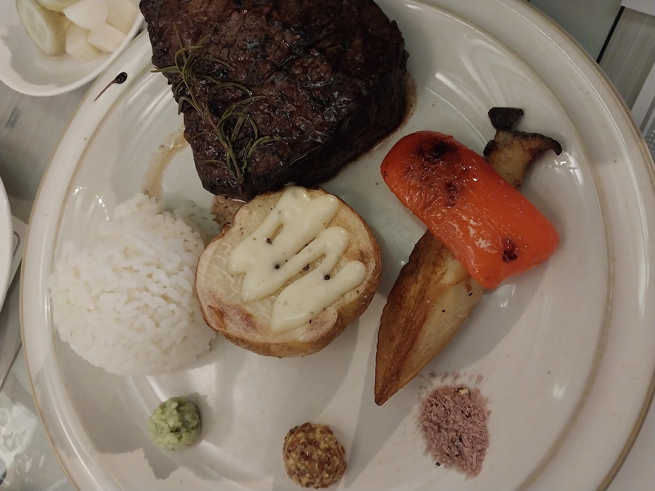 그렇게 찾아간 곳은 옛날 커다란 마당이 있는 한옥집을 식당으로 리모델링 한 곳이었다. 그래서인지 넓은 마당과 통창으로 분위기가 좋았다. 스테이크, 샐러드, 파스타를 시키고 부모님은 와인을 주문해 드렸다. 부모님은 기분이 좋으신지 짠 하며 와인을 드셨다. 난 그 모습을 사진에 담아 남매방에 올렸다. 그러자 언니들이