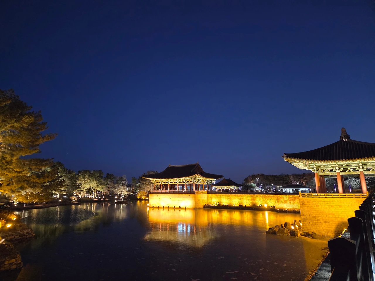 숙소에 짐을 풀고 바로 '동궁과 월지'로 향했다. 10여 년 전에 낮에 가본 곳인데 야경이 아름다워 꼭 밤에 가보고 싶었기에 해가 진 후 그곳으로 향했다. 6시쯤 되었지만 해가 져서 그런지 풍경이 너무 아름다웠다. 아빠는 이곳저곳 감상하시느라 뒤늦게 오시고, 나와 엄마, 딸은 앞서 먼저 갔다. 아직 1월이라 그런지 많이 추웠다. 여기저기서 엄마, 아빠, 딸아이 사진을 찍어주며 한바뀌 돌고 나왔다.