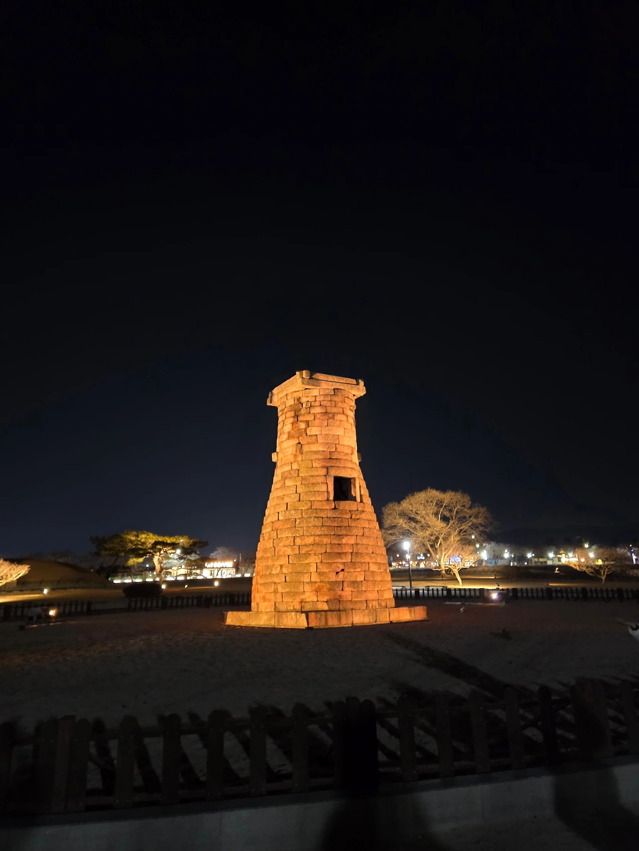 이후 인근에 있는 첨성대로 향했다. 공영주차장에 차를 세우고 10여분 걸어가니 첨성대가 보였다. 첨성대 역시 은은한 조명이 비추고 있어 낮에 볼 때와 또 다른 분위기를 내고 있었다. 옆에 7시 30분에 미디어쇼가 있다고 입간판에 쓰여 있었다. 7시 15분이라 15분만 기다리면 되니 신나서