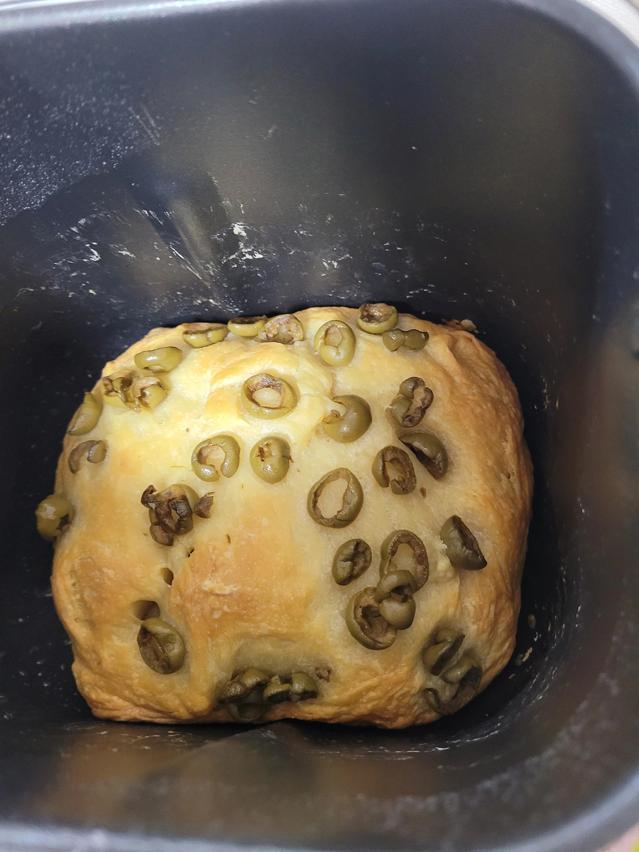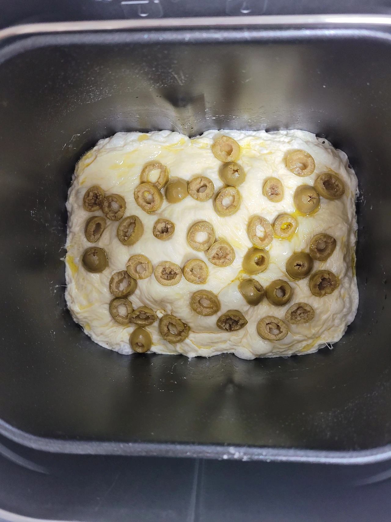 반죽 위에 올리브유를 바루고 올리브 조각을 위해 올린 후 굽기 버튼을 눌렀습니다.