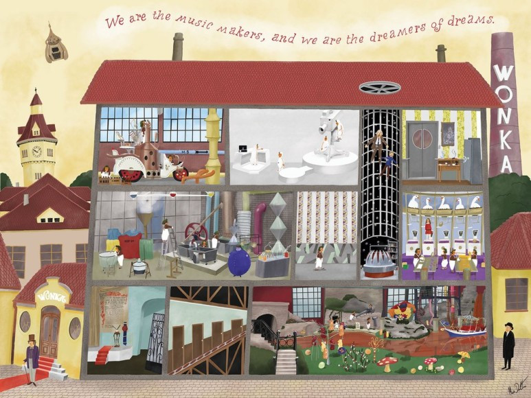 Charlie and Chocolate Factory(찰리와 초콜릿 공장) 에서 영감을 받아 그린 작품인데요, 맥스 달튼은 영화의 장면을 그대로 일러스트화 시키는게 아니라, 영화의 장면들과 시공간을 하나에 표현하는 것을 좋아합니다. 건물의 단면을 잘라 그 공간속에서 이루어지는 해프닝들을 보여주는 기법 또한 Wes Anderson이 영화에서 사용하였던 방법인데요 자기 나름대로의 해석을 통하여 새롭게 표현해 낸 것이 인상적이였습니다.
