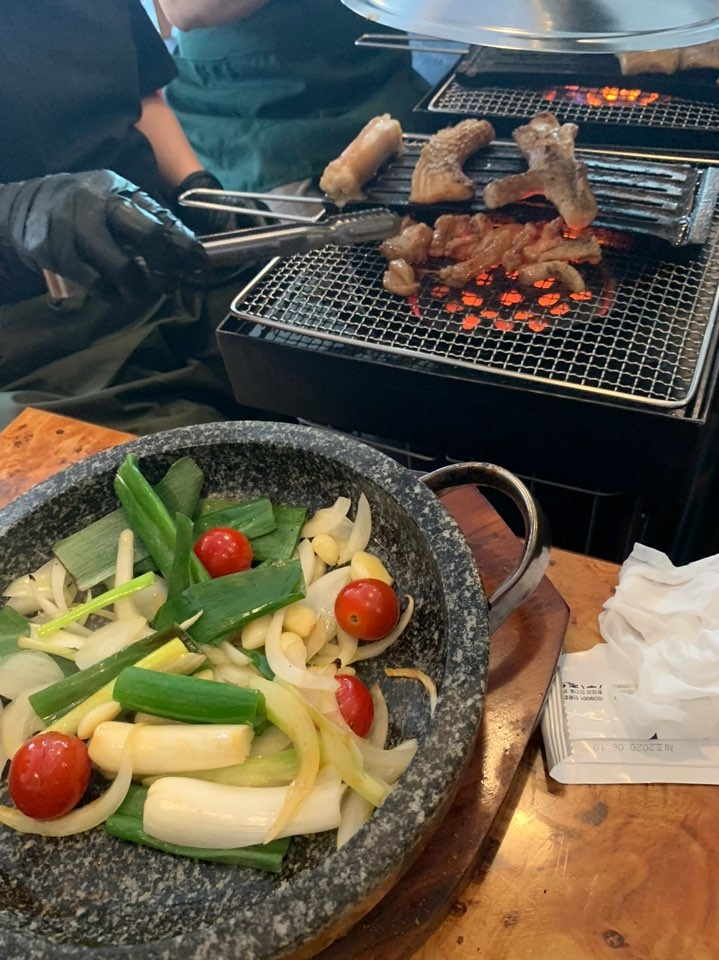 각각의 테이블들 옆에 '난로'라고 일컫는 화로가 있고 그앞에 스킬 가득 갖고 계신 직원 아주머니들께서 맨투맨으로 담당하여 각종 메뉴들을 직접 구워주신다. 그 후에 테이블에 구운 야채가 들어있는 돌로 된 냄비에 익은 부위들을 하나하나 올려주신다. 이 냄비가 은마의 상징이 아닐까 싶다. 물티슈 치우고싶다.