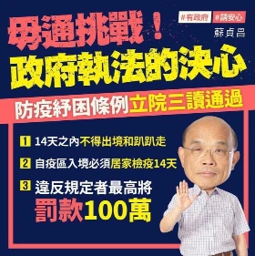 자가격리를 위반할 경우 벌금 100 타이완 달러라는 경고문 (우리나라 원화로 환산하면 대략 4,000만원)