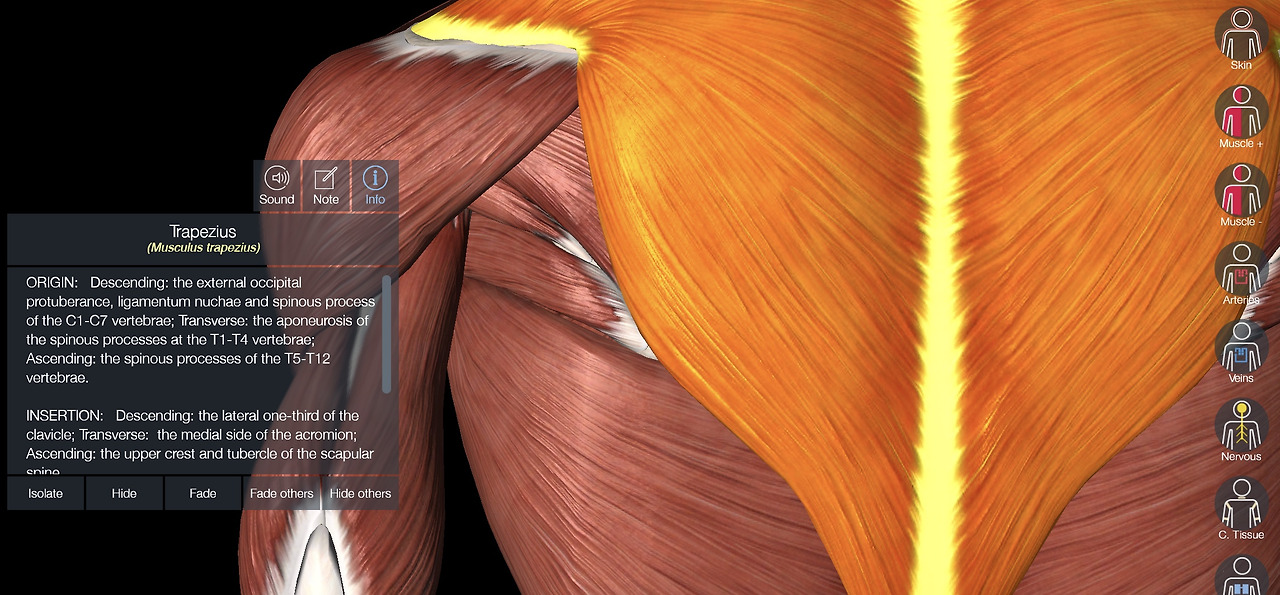 모형 상에서 빛나는 근육은 승모근(trapezius)이다. 모든 근육은 origin과 insertion이 존재하게 되는데, 간단하게 설명하면 origin은 근육이 움직이지 않는 쪽, insertion은 근육이 움직이는 쪽이다. 당연히 예외가 존재한다. 승모근의 origin은 위에서 볼 수 있듯이, ext.occipital protuberance, ligamentum nuchae, spinous process of C1-T12 등이 있다. 이 부위에 붙은 근육은 움직임이 없다는 뜻이다. 승모근의 insertion은 lat. 1/3 of clavicle, medial side of the acromion 등인데, 해당 부착지는 움직임이 존재한다는 뜻이다. 여기서 골학 공부의 중요성이 나타나는데, spinous process가 척추 뼈의 어느 곳인지, acromion이 어느 뼈의 구조물인지를 정확히 알고 있어야 공부하면서 머리 속으로 위치를 상상할 수 있다.