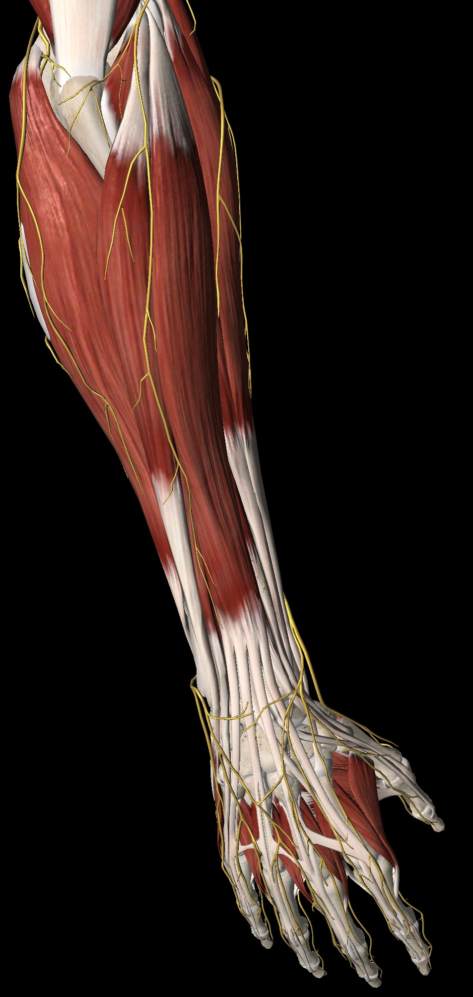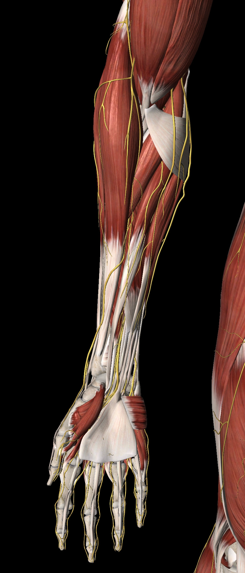 좌측 사진은 손바닥면, 우측 사진은 손등면이다. 이는 지금 모든 근육과 신경을 표시한 상태이고 기타 혈관은 표시하지 않았다. 근육은 겉에서 보는 것과는 다르게 내부에도 여러 층으로 이루어져 있다. 우리가 흔히 말하는 ‘전완근’은 이렇게 많은 근육으로 이루어져 있는 것이다. 근육은 크게 굽힘 근육(flexor)와 폄 근육(extensor)로 나뉜다. 이 외에도 adductor, abductor, opponens 등의 종류가 존재하고, 다양한 동작을 수행하는데 도움을 준다.