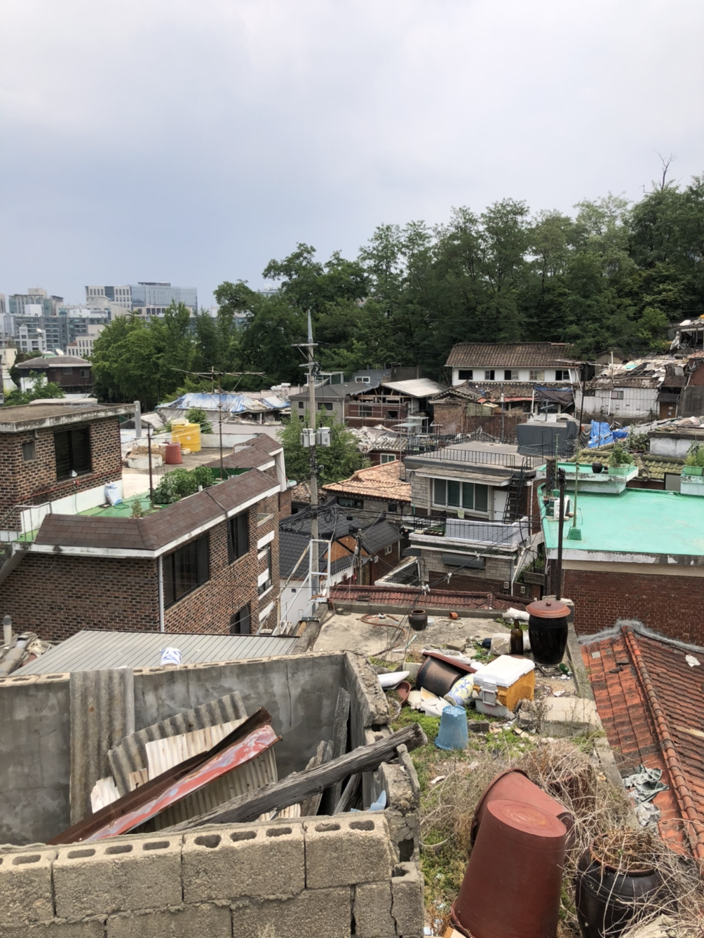 전시장 주위에는 연식이 조금 되어 보이는 아파트 단지 하나와 그곳에 오래 자리를 지켰을 집들, 사람이 살긴 할까 싶은 낡은 건물이 대부분을 이룬다. 언덕 위에 올라 내려다보면 관리가 잘 된 주택도 드물게 있지만 대부분의 집에는 고지서와 전단지가 덕지덕지 붙어있고, 각종 폐기물로 뒤덮여 넝마를 둘러쓴 듯한 집이 절반 정도를 이룬다. 전시장에 근무하는 시간 동안 파편 같은 정보를 흘리는 주민들의 이야기를 조합해보니 이런 까닭이었다.