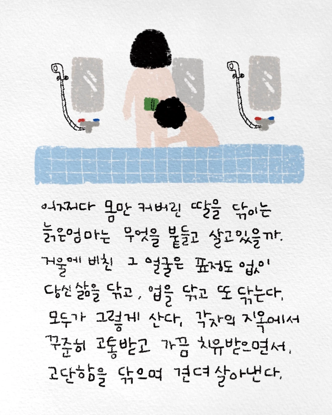 당신보다 한참이 큰 딸의몸을 닦는 엄마