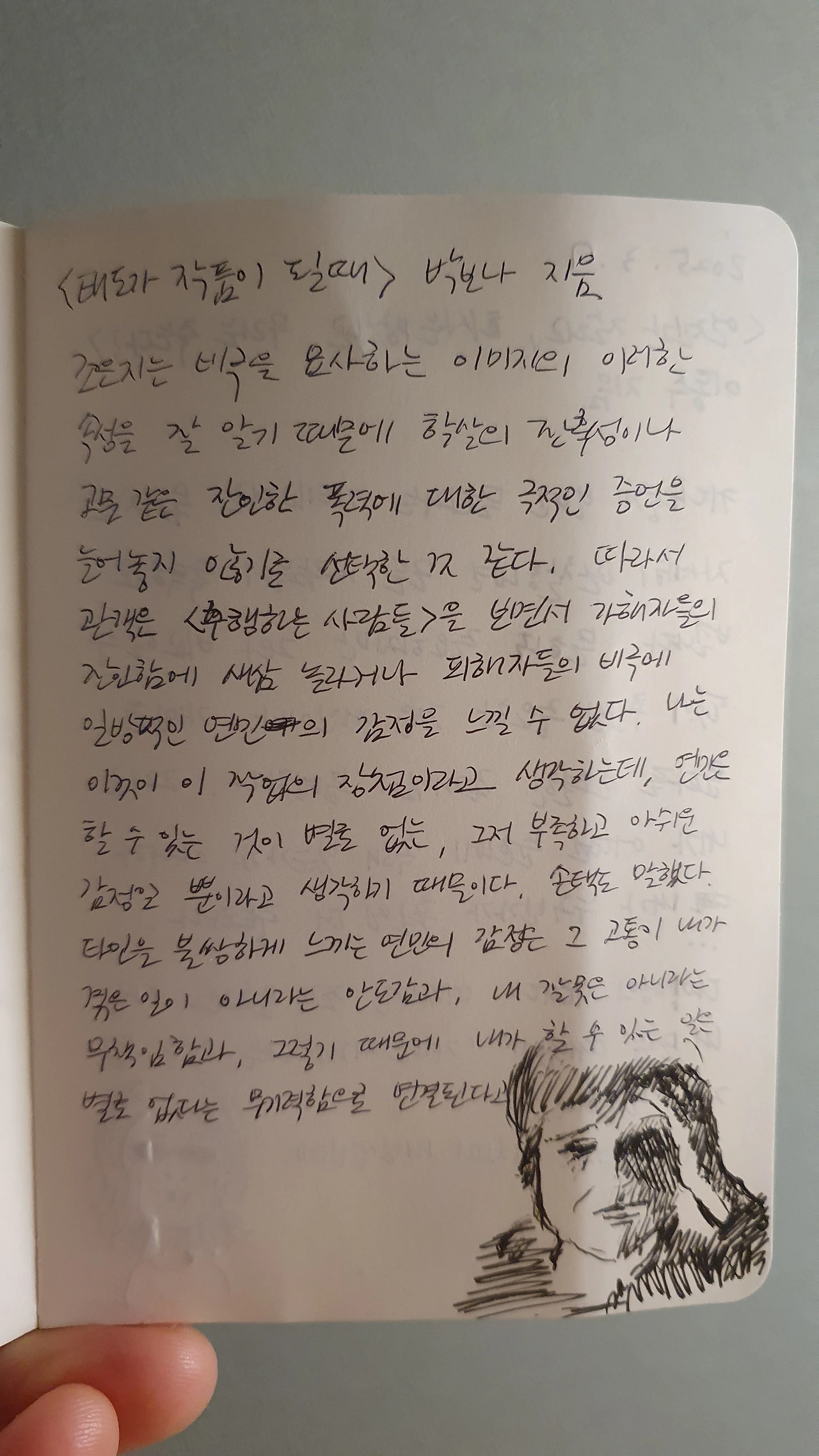조은지는 비극을 묘사하는 이미지의 이러한 속성을 잘 알기 때문에 학살의 잔혹성이나 고문 같은 잔혹한 폭력에 대한 극적인 증언을 늘어놓지 않기로 선택한 것 같다. 따라서 관객은 <수행하는 사람들>을 보면서 가해자들의 잔인함에 새삼 놀라거나 피해자들의 비극에 일방적인 연민의 감정을 느낄 수 없다. 나는 이것이 이 작업의 장점이라고 생각하는데, 연민은 할 수 있는 것이 별로 없는, 그저 부족하고 아쉬운 감정일 뿐이라고 생각하기 때문이다. 손택도 말했다. 타인을 불쌍하게 느끼는 연민의 감정은 그 고통이 내가 겪은 일이 아니라는 안도감과, 내 잘못은 아니라는 무책임함과, 그렇기 때문에 내가 할 수 있는 일은 별로 없다는 무기력함으로 연결된다고.