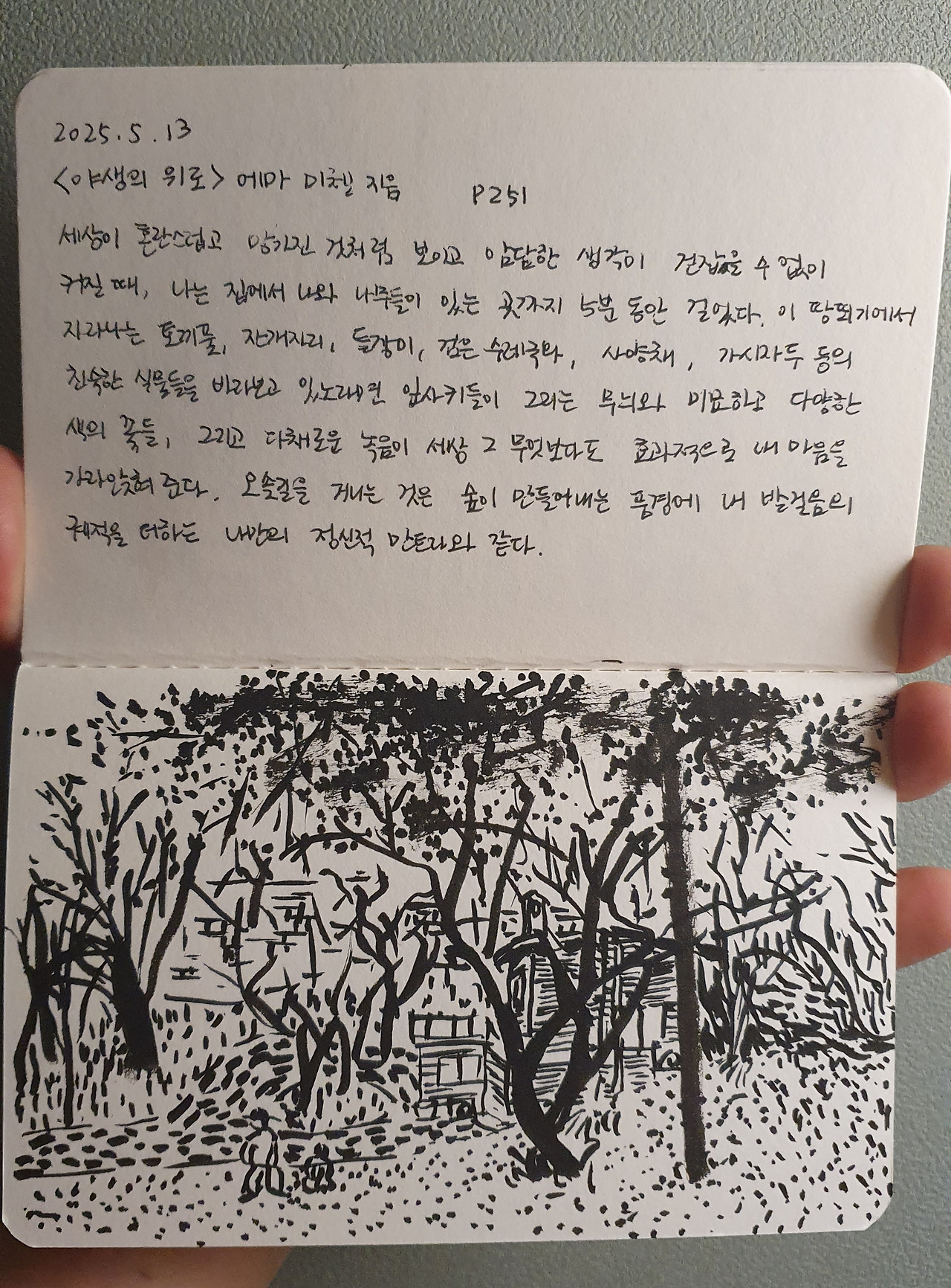 세상이 혼란스럽고 망가진 곳처럼 보이고 암담한 생각이 걷잡을 수 없이 커질 때, 나는 집에서 나와 나무들이 있는 곳까지 5분 동안 걸었다. 이 땅뙤기에서 자라나는 토끼풀, 잔개자리, 들장미, 검은수레국화, 사양채, 가시자두 등의 친숙한 식물들을 바라보고 있노라면 잎사귀들이 그리는 무늬와 미묘하고 다양한 색의 꽃들, 그리고 다채로운 녹음이 세상 그 무엇보다도 효과적으로 내 마음을 가라앉혀준다. 오솔길을 거니는 것은 숲이 만들어내는 풍경에 내 발걸음의 궤적을 더하는 나만의 정신적 만트라와 같다