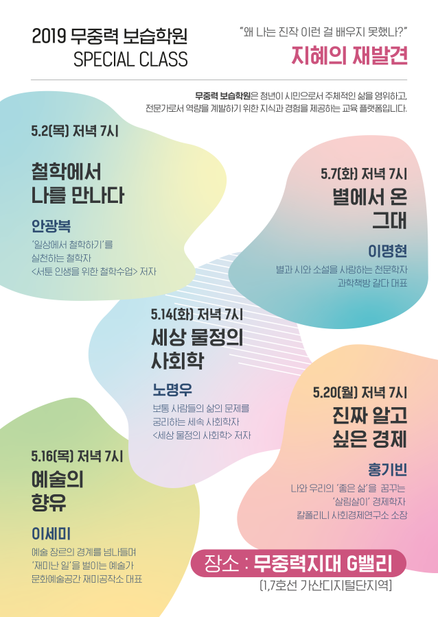 강사진의 뛰어난 스피치는 숨겨진 지혜를 캐낼 수 있었고, 더불어 참가자의 똘망똘망한 눈동자와 열심히 기록하는 모습으로 봄학기 특강은 풍성한 지혜의 향연이었습니다.
