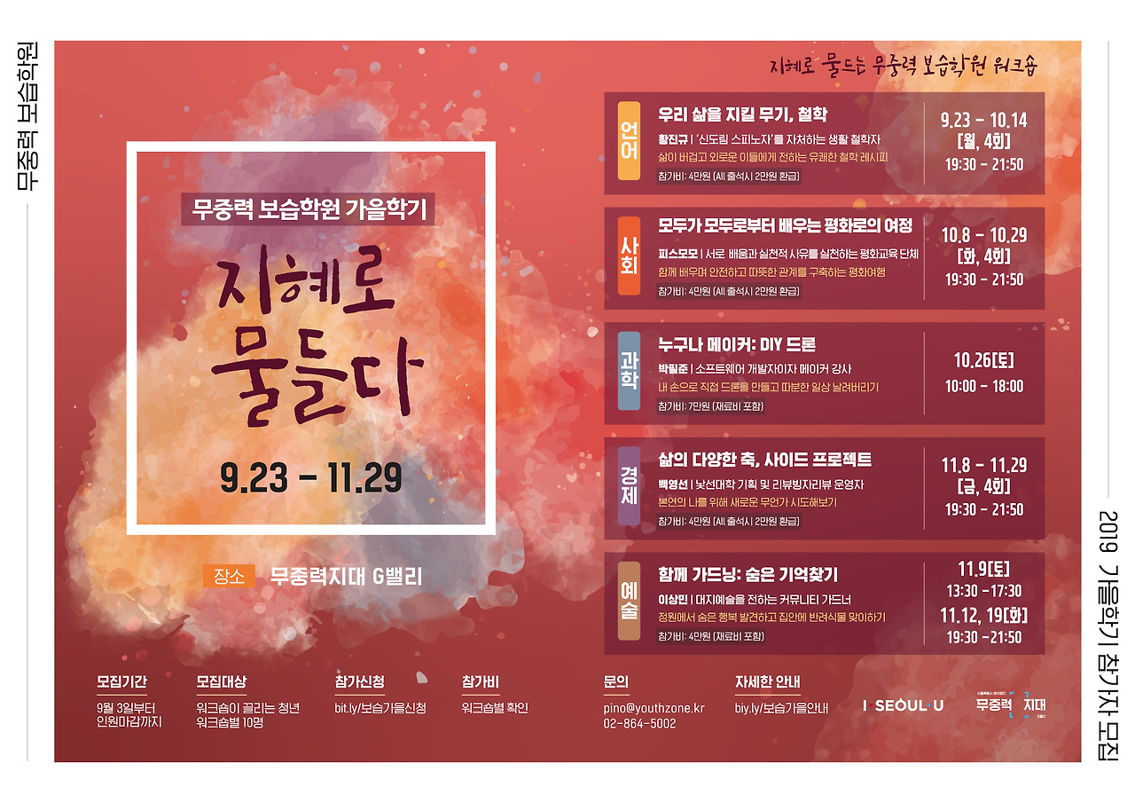 대망의 가을학기가 찾아왔어요. 여름학기와 마찬가지로 Cooperator 임별아 님께서 '지혜로 물들다'라는 슬로건으로 포스터를 만들어 주셨습니다. 이번 학기는 '나'를 넘어 '우리'로 시선을 넓혀 보는 시간으로 워크숍을 구성했습니다.