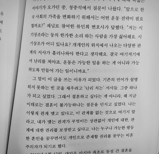 누군가 자신이 폴리아모리스트라고 하는 것이 모두가 폴리아모리스트가 돼야 하며 이게 독점 연애보다 우월하다는 의미가 아닌데, 익숙하지 않은 모양의 삶을 접했을 때 그 불안감을 핑계로 사회에서 없어져야 할 바이러스 취급하는 일이 얼마나 많던가. 폴리아모리가 퀴어의 범주에 들어가겠냐는 질문이 책 중간에 있었는데, 퀴어냐 아니냐를 떠나 어차피 사회와 미디어가 모범답안이라고 보여준 작은 원이 내 스타일이 아니라고 말한 모든 사람들이 처하는 상황은 비슷비슷하다. 내 삶의 모양을 드러내면 공격을 받고, 내가 누구인지 말하는 것이 남의 삶도 그렇게 계몽하려는 것이 아니냐는 눈총을 받고, 그래서 지워야 할 존재로 취급을 받고.